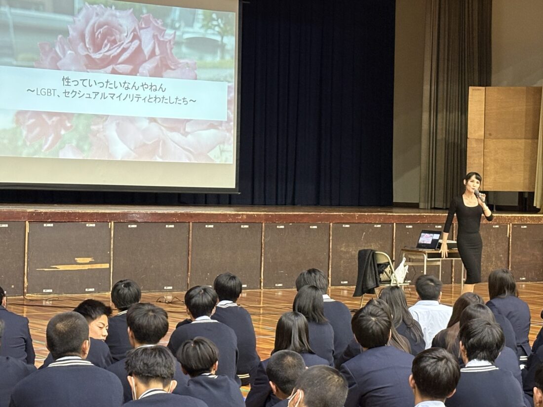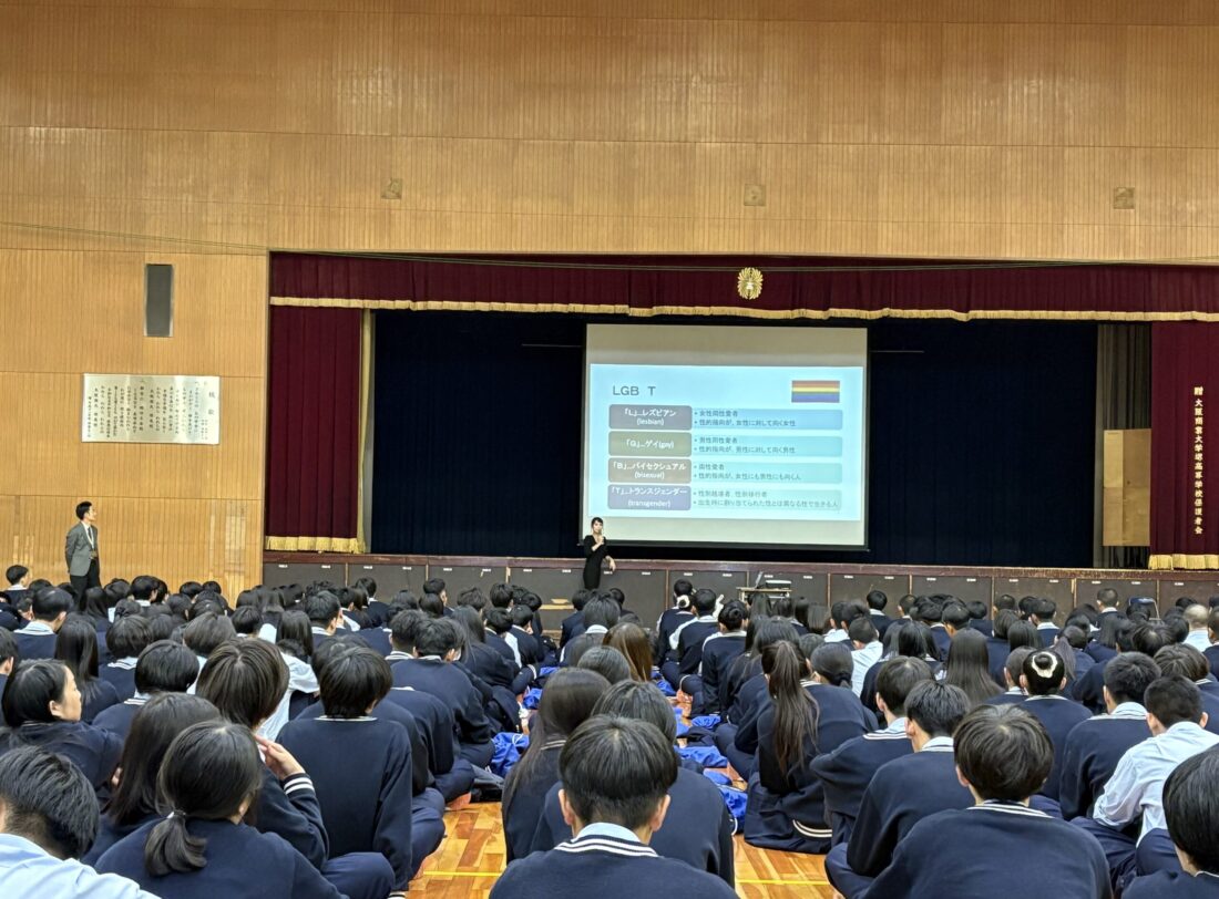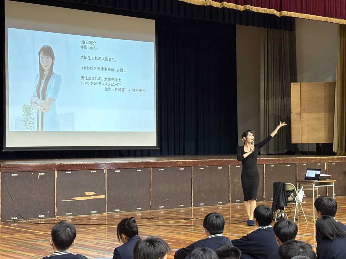 本校では、弁護士であり大阪公立大学非常勤講師としてもご活躍中の仲岡しゅん先生をお招きし、第1学年と第2学年を対象に「多様な性」についての講演会を行いました。