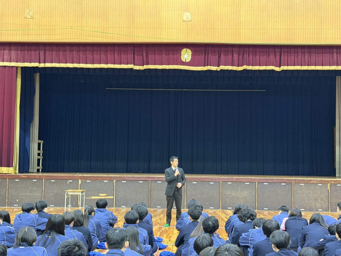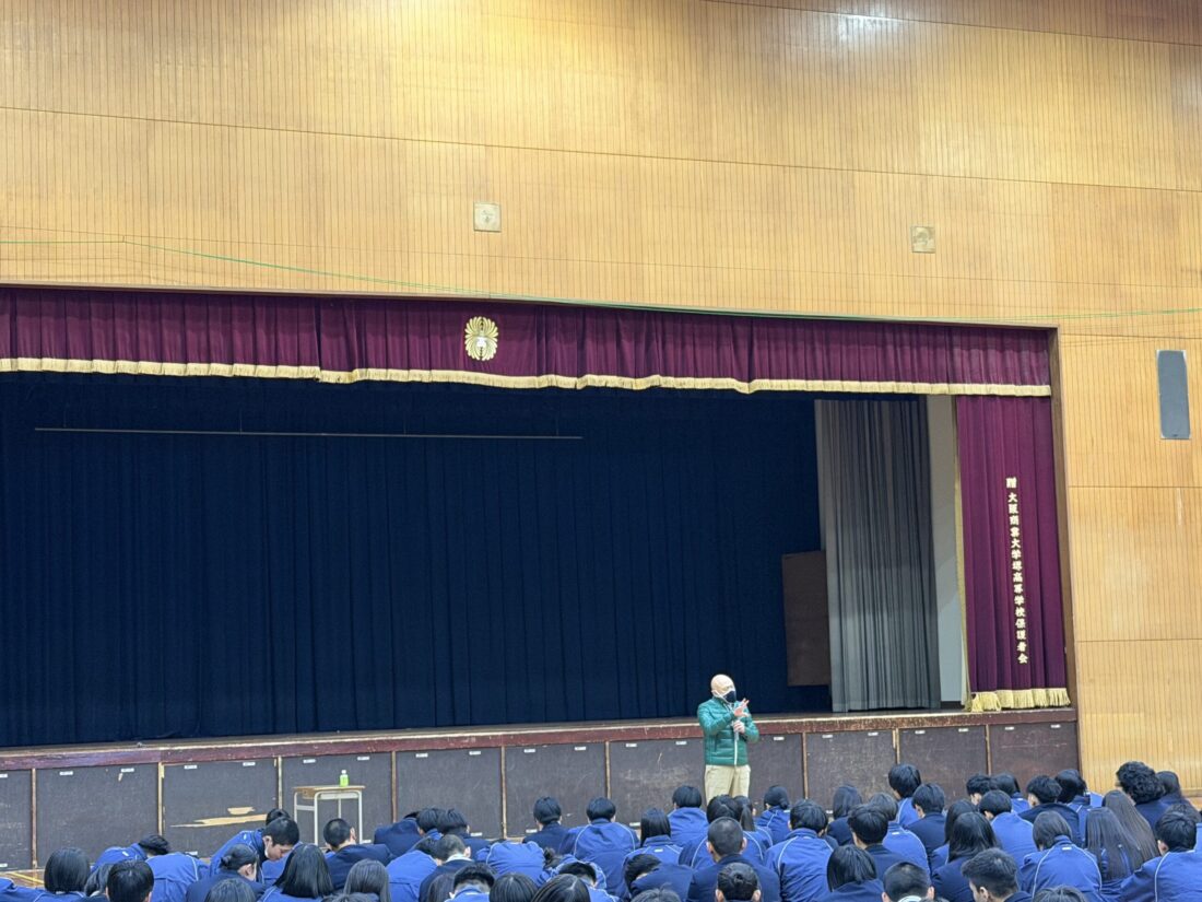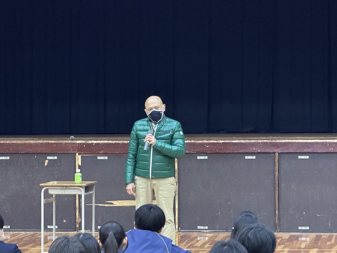 最後には、「商大堺高校のみなさん。薬物を初めて使おうかなと思ったとき、その瞬間、君たちのその後の人生を全て捨てることになる。その勇気がありますか?私をみてぜひ考えてみてください。」という言葉がとても印象的でした。生徒たちは、寒い体育館の中でも、猪瀬氏の生い立ちや最近中高生に広がっている大麻などの薬物の怖さを真剣に聞いていました。